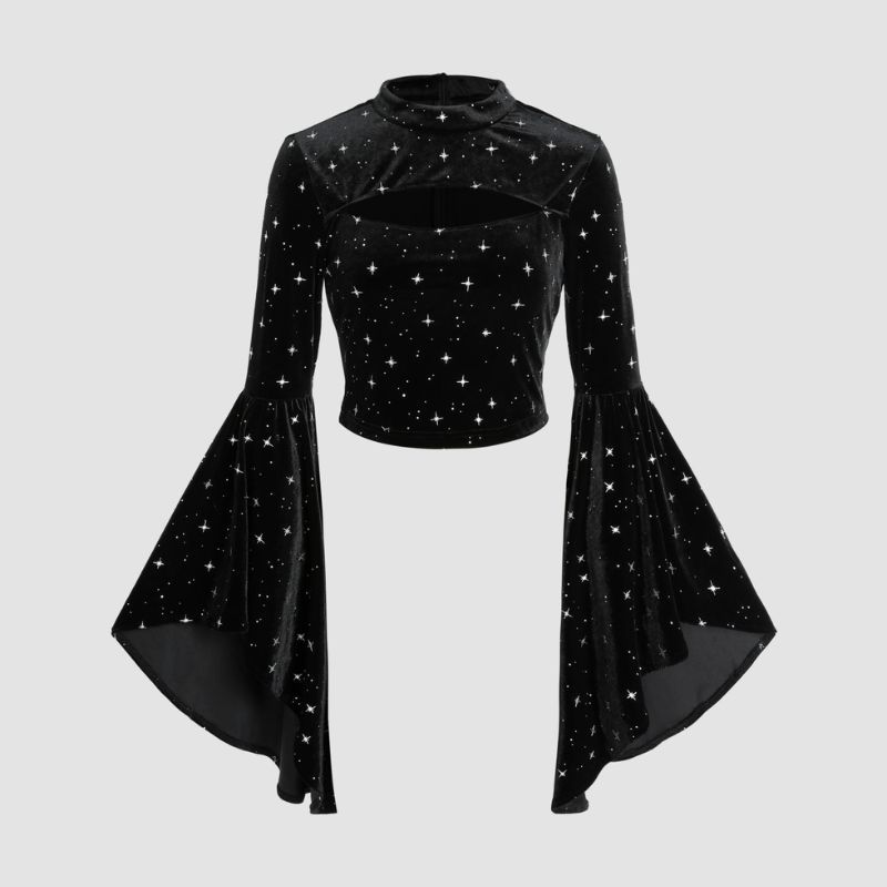 “A bell sleeve top, reminiscent of Stevie Nicks and bohemian ’70s fashion, is so very whimsigoth,” says Rebecca.