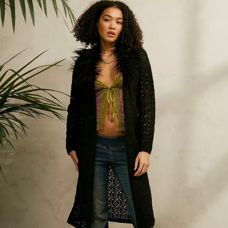 A popular coat for this look is a pleather or leather coat with a faux fur collar. Worn over a maxi dress or with flared trousers, it gives a real ’70s meet ’90s vibe that works for the whimsigoth trend and beyond.